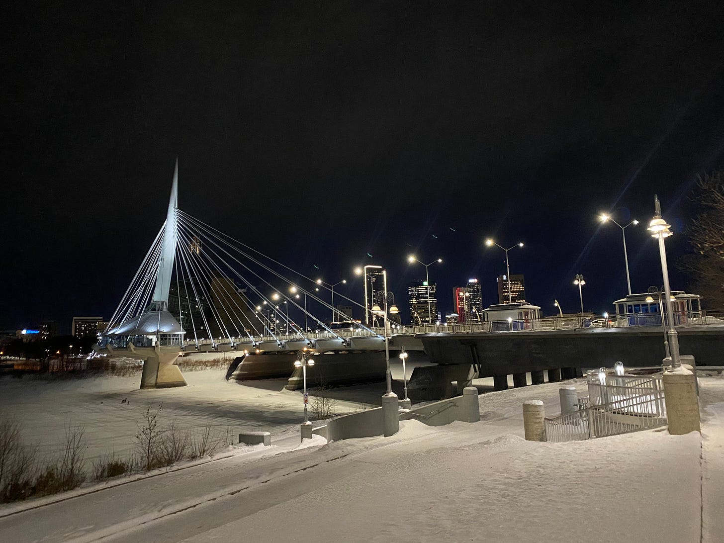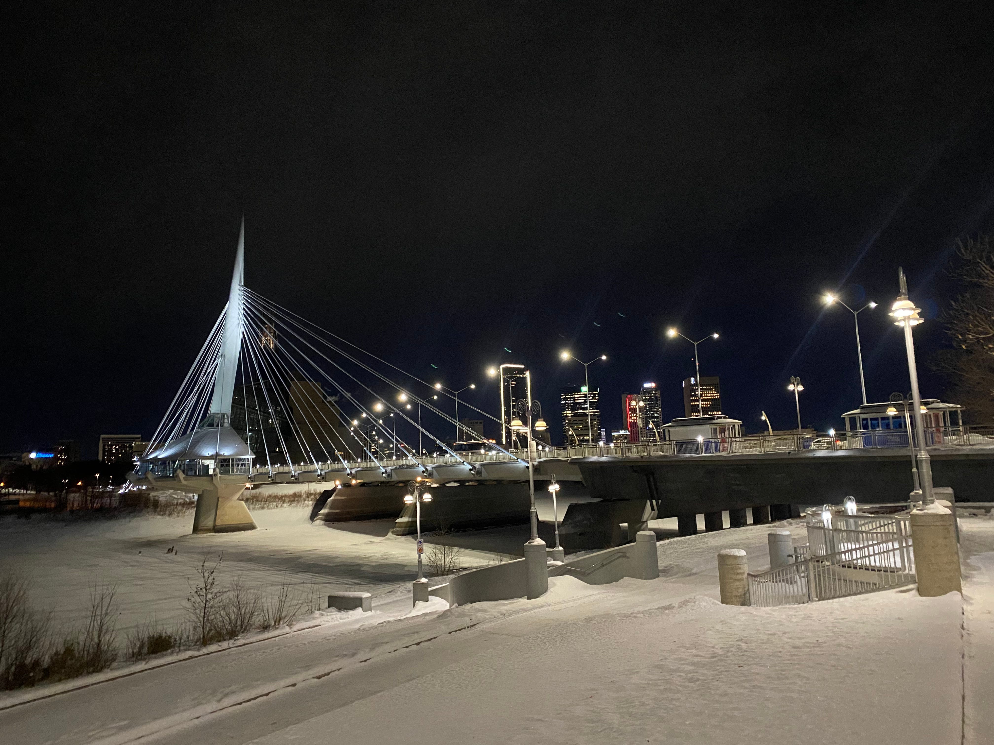 But then, I go for a walk over the Esplande Riel on a mild winter night, and I see the Forks alight with colours of every hue. I see skaters braving the cold to glide and stumble down the frozen Red River. I see the skyline lit up, those short and grey excuses for skyscrapers suddenly turned bold and bright beacons who banish the darkness. A bus passes and the faces inside look weary and yet unbroken by this city’s wanton ways.